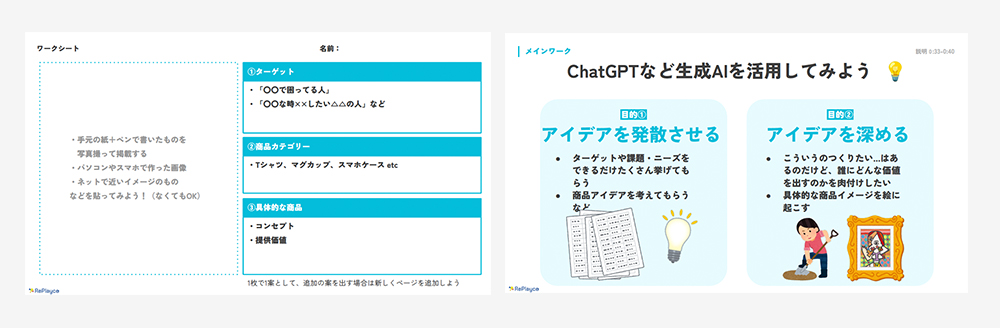 続いて、ChatGPTなどの生成AIを活用してアイデアを膨らませる方法が紹介されました。講師が実際の使い方を見せながら、どのようにAIを使えば発想を広げられるのか、また考えを整理してワークシートにまとめるコツを解説。