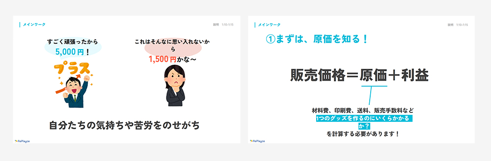 自分のアイデアを形にする楽しさを体感したところで、またまた講義は難しい領域に。。。第2回の後半では「実際につくったものをいくらで売るか?」という大人顔負けの難題に取り組んでもらいます!