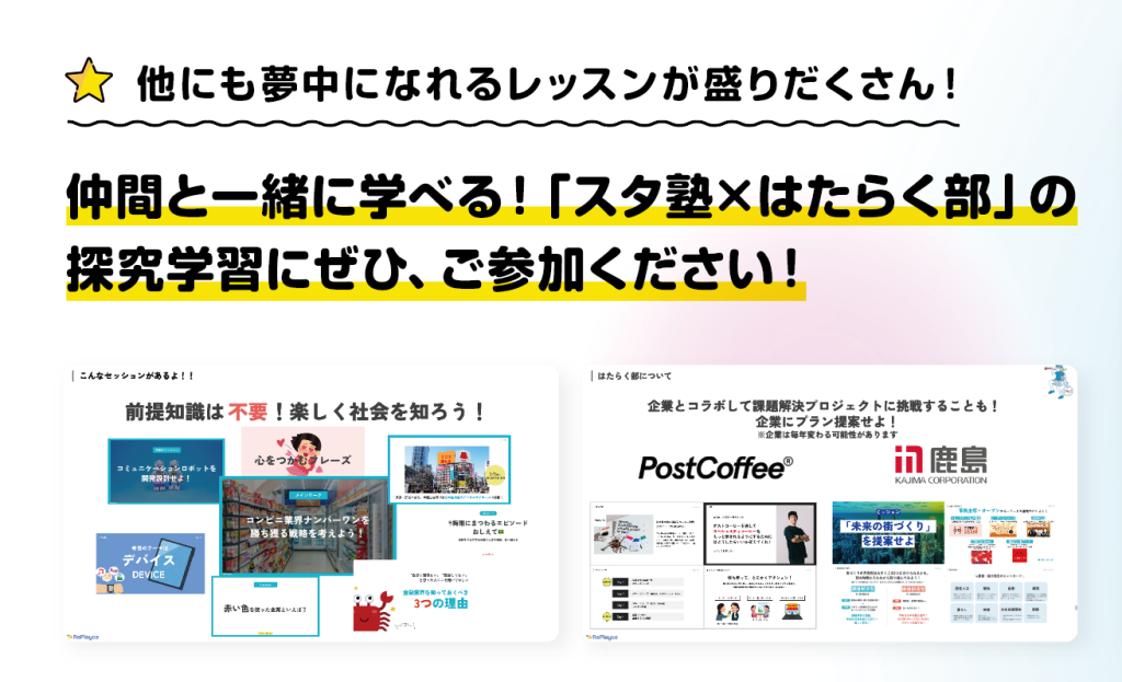 「スターAI情報塾」と「はたらく部」が行う探究学習プロジェクトでは、これからもさまざまな体験プログラムを展開していく予定です。