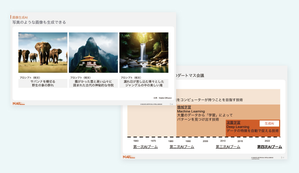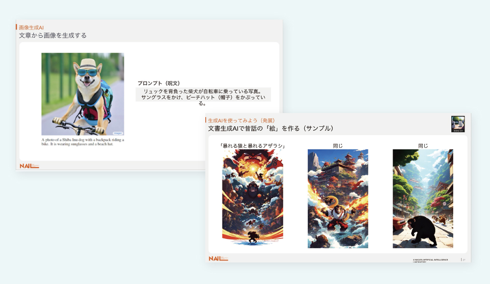 この講座では主に「画像生成AI」と「文章生成AI」の2つを体験します。