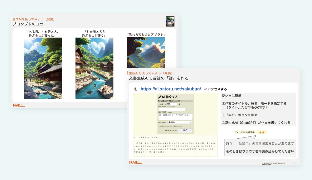 画像生成や文章生成を実際に体験しながら、AIの仕組みやリスク、そして正しい付き合い方を学びます。