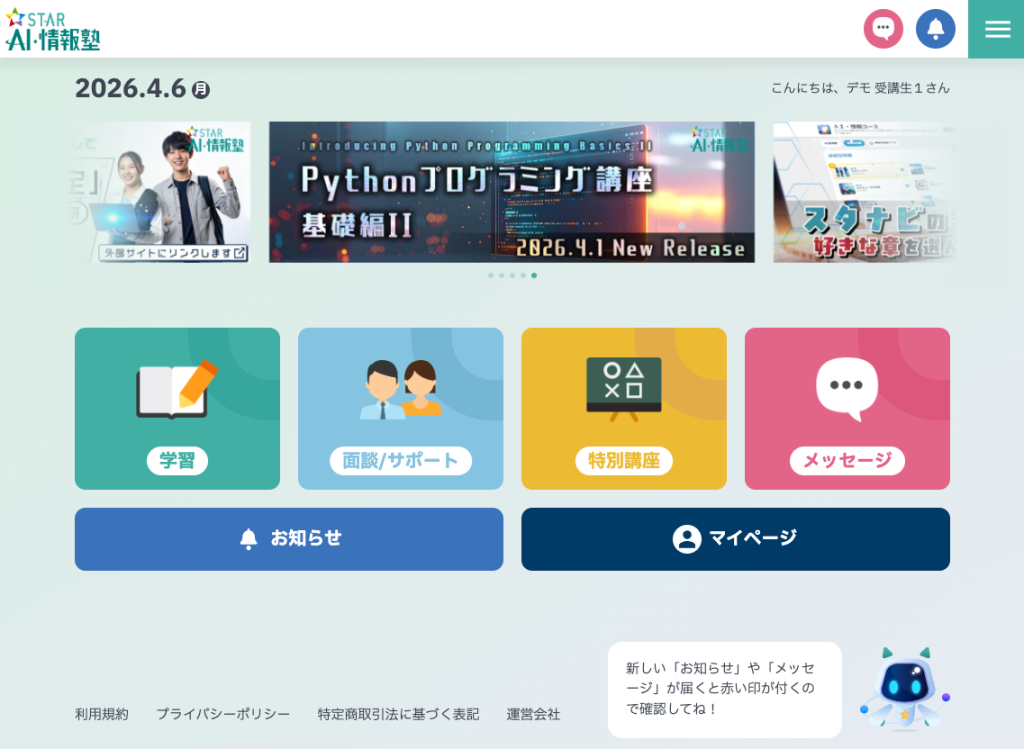 一部チュートリアル(学習の進め方)などは、お申込み完了後、2営業日後からご利用いただけます。