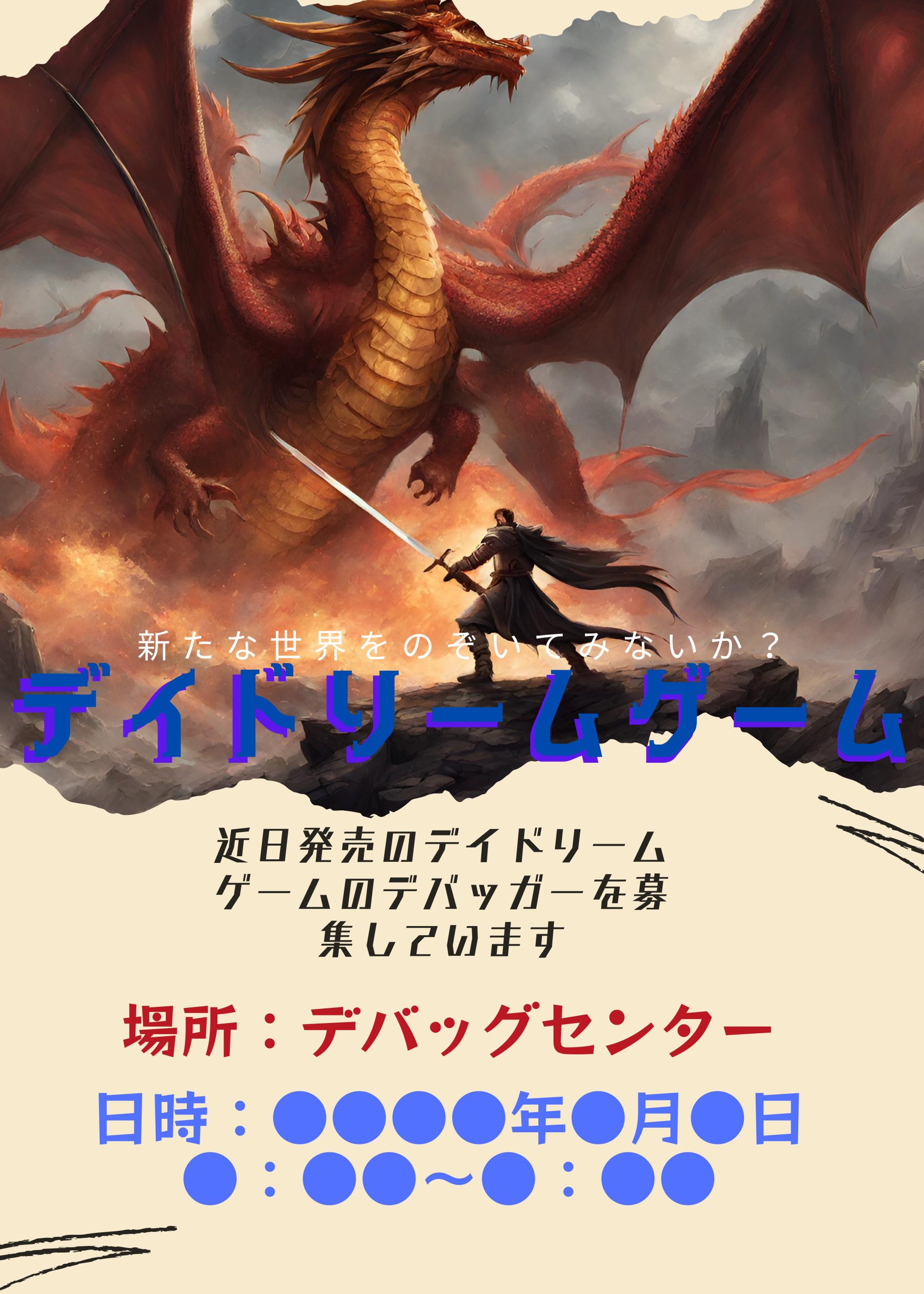 - ゲームデバッガー募集という珍しいテーマ選びが面白いですね!タイトルを大きく配置し、必要な情報(日時・場所)もしっかり構造化されています。全体的に視線移動を意識したレイアウトで、ターゲットである若者の興味を引く工夫が見られます。オリジナリティのある素敵なポスターです!