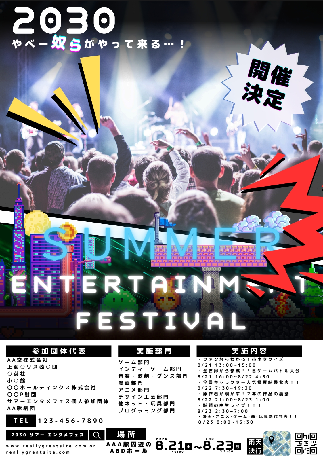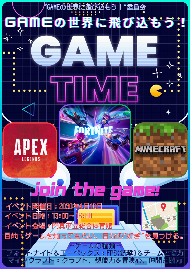 - レトロゲーム風のデザインが個性的で目を引きます!「GAMEの世界に飛び込もう!」のコピーと「join the game!」の英語がかっこいい!人気ゲームのアイコンもゲーム好きの興味UP!イベント情報も構造化されて見やすく整理されています。ゲーム愛が伝わる作品です。