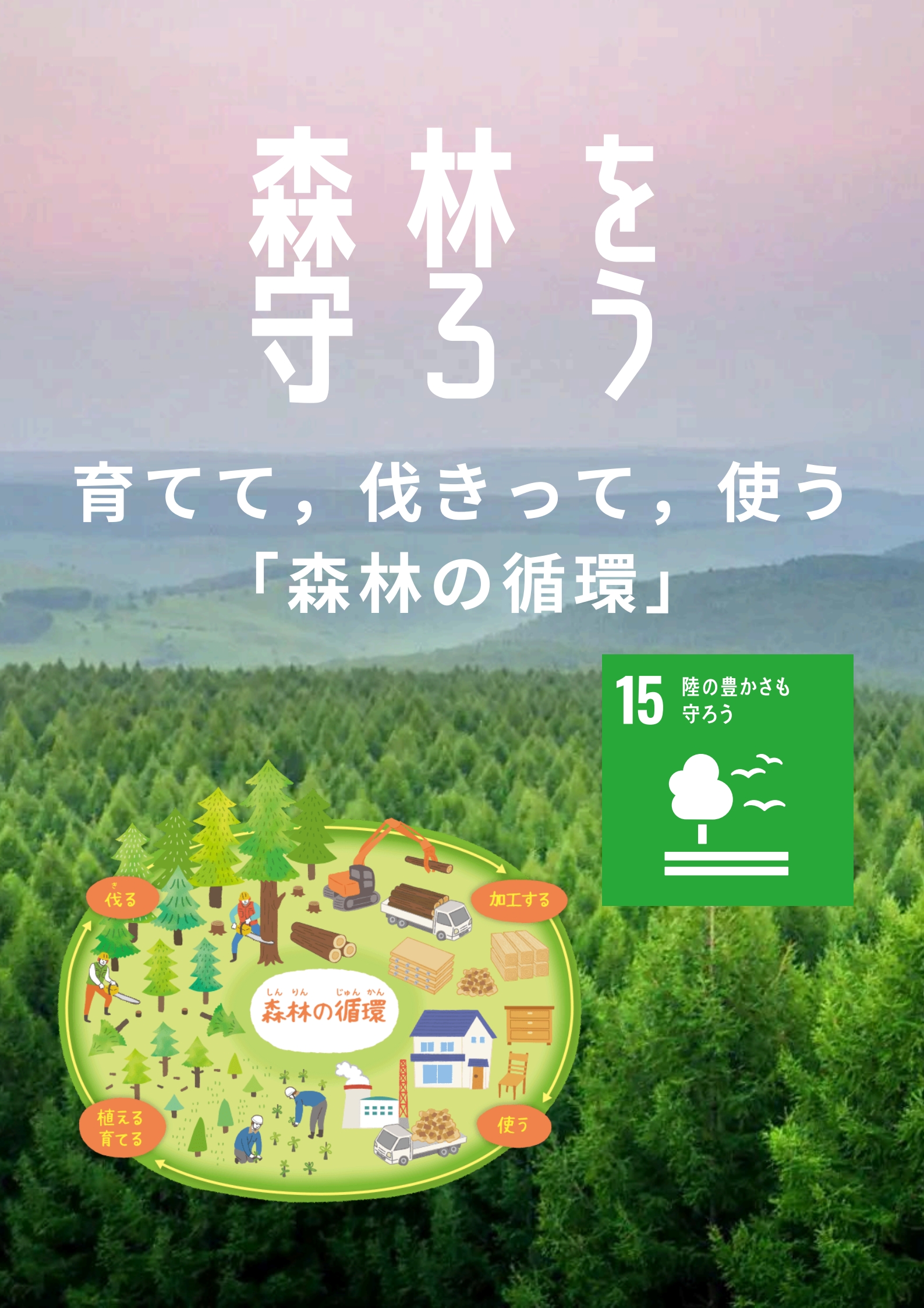 - SDGsがテーマの意義あるポスターですね。「育てて、伐きって、使う」というコピーと、中央のインフォグラフィックで森林の循環を表現。背景の写真とイラストの組み合わせも効果的で、視線が自然に上から下へ流れる構造です。環境問題への意識と、情報デザインが両立した素敵な作品です!