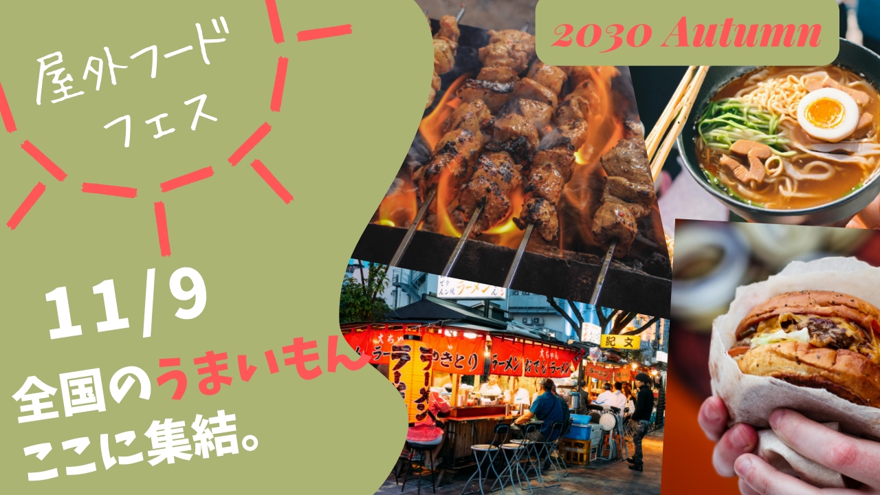 - 「全国のうまいもんここに集結。」が食欲をそそり、フードフェスに行きたくなるポスターです。料理写真の配置も効果的で、視線が自然に左から右へ流れるレイアウトです。大きな開催日の表示など、構造化されて見やすいです。秋を感じさせる色使いを採用したのも素晴らしい!