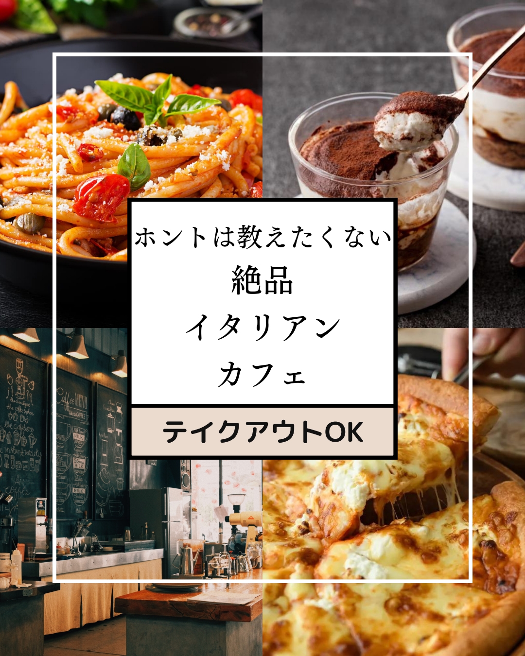 - 「ホントは教えたくない絶品イタリアンカフェ」のキャッチコピーが秀逸!好奇心を刺激します。パスタ、デザート、ピザ、店内とバランスよく配置された写真は、お店の雰囲気と魅力を伝えつつ視線誘導。白枠で情報を構造化して見やすくまとめてもいます。「テイクアウトOK」の情報も効果的!
