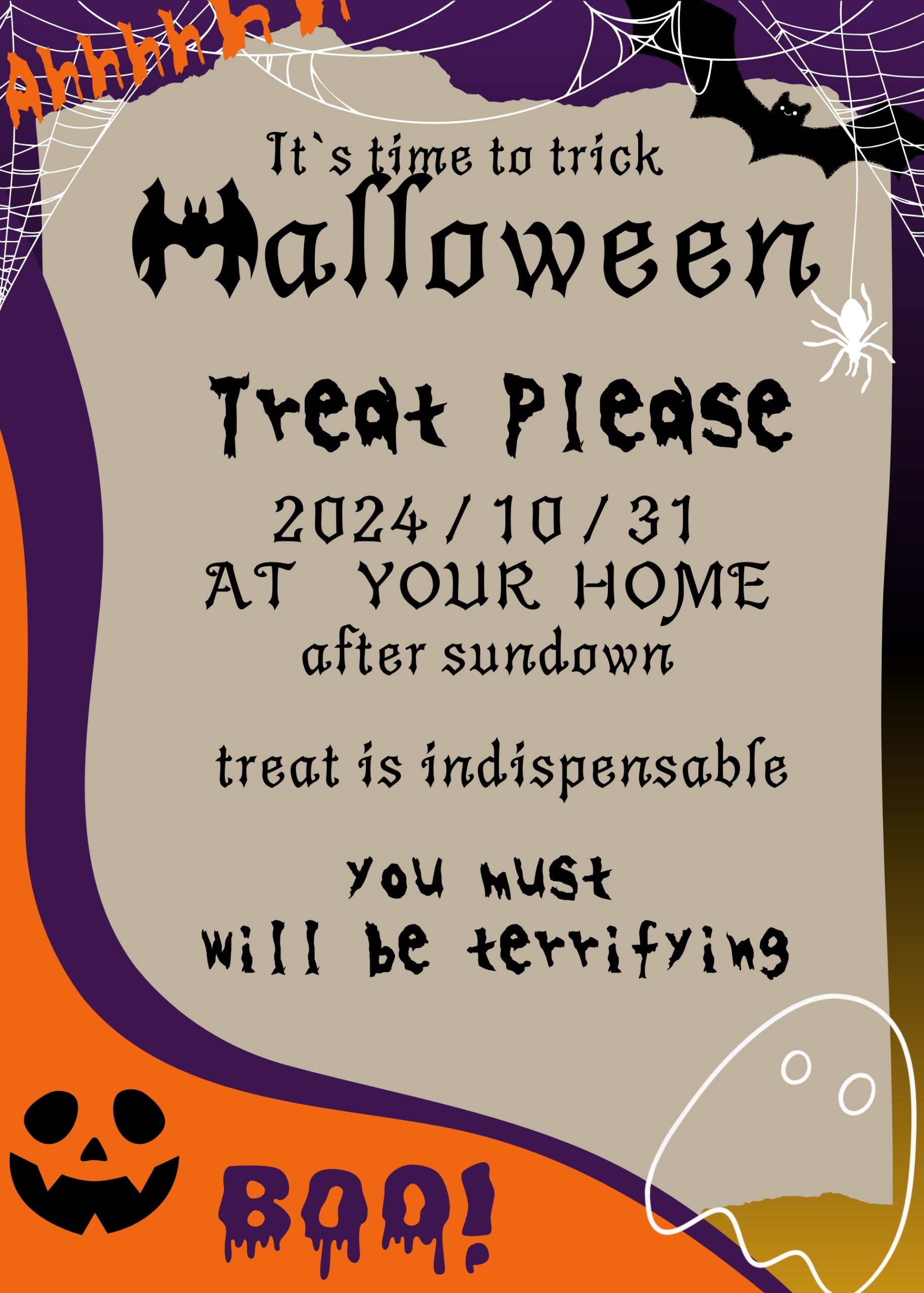 - ハロウィンをテーマに英語で統一されたグローバル作品です!英語で書かれたお馴染みのフレーズと「Ahhh..」「BOO!」のおどろおどろしいフォント表現で恐怖も演出。日時・場所・注意事項が構造化されて整理され、視線移動もしっかり自然な流れになっていますよ。