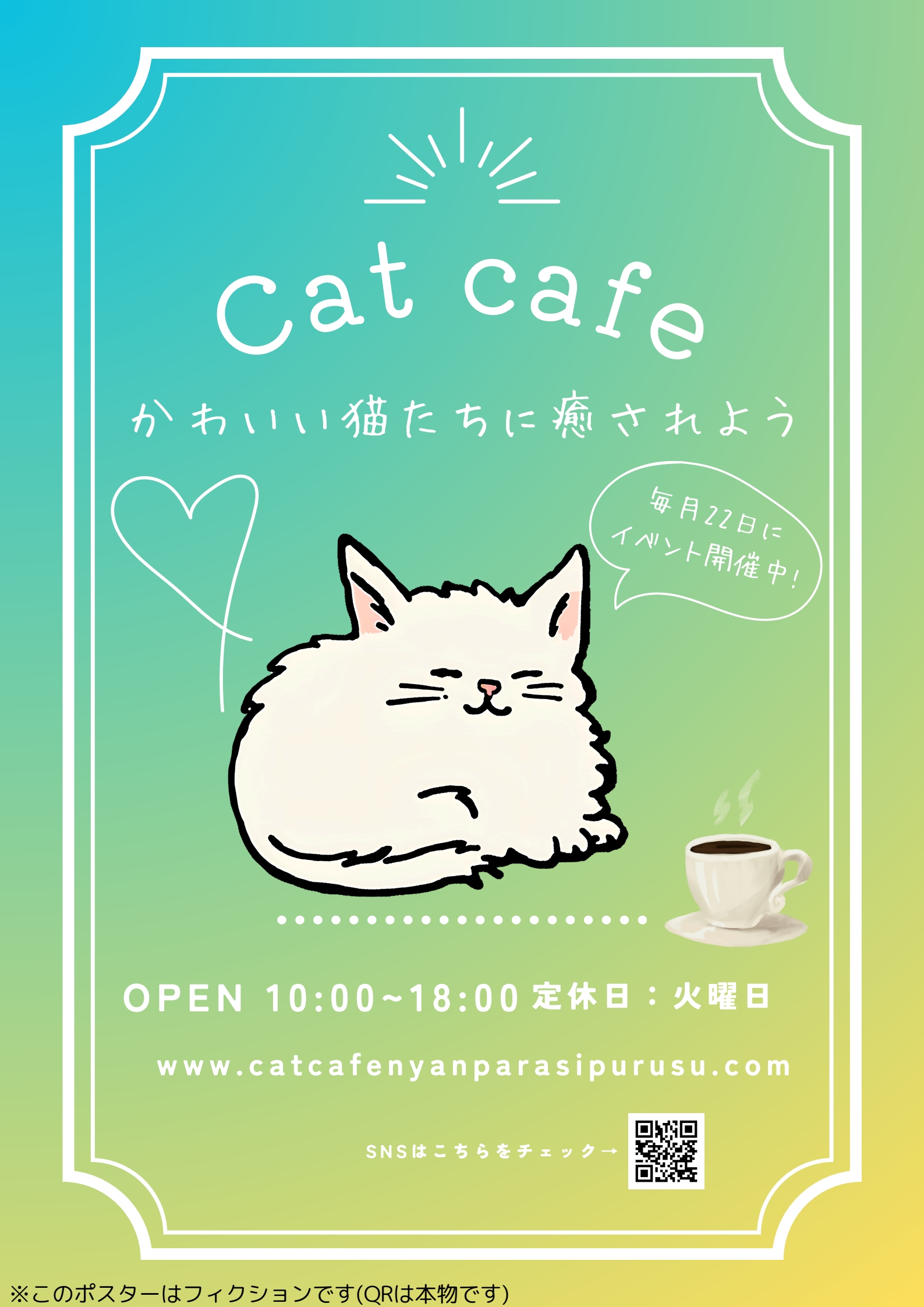 - カラーやイラストで猫カフェの「癒し」がしっかり表現されています。店名やキャッチコピーは大きく配置し、営業時間や定休日、毎月のイベント情報、SNS情報まで構造化されて見やすく整理されていますね。現代の情報技術「QRコード」もGood!さまざまな情報の学びが詰まっています。
