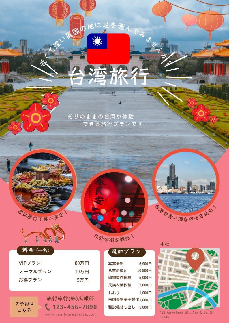 - 「近くて遠い異国の地に足を運んでみませんか?」のコピーはとても気に入りました!料金プラン、追加オプション、夜市、海、九份など台湾の魅力を文字で可視化し、QRコードで予約へ誘導する実用性も◎。多い情報量を、レイアウトを工夫してまとめた努力が伝わる作品です!