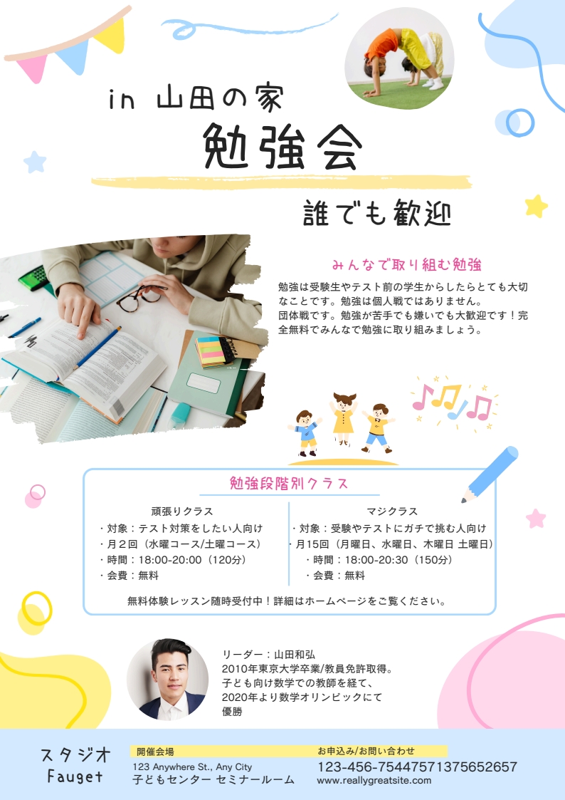 - 「誰でも歓迎」のコピーと明るく親しみやすいデザインで、勉強会の雰囲気が伝わってきます!2つのコースを表で構造化して分かりやすく整理し、講師紹介で信頼感UP。写真やイラストの配置などで視線が上から下へ流れるレイアウトです。情報デザインの学び活かされた完成度の高い作品です!