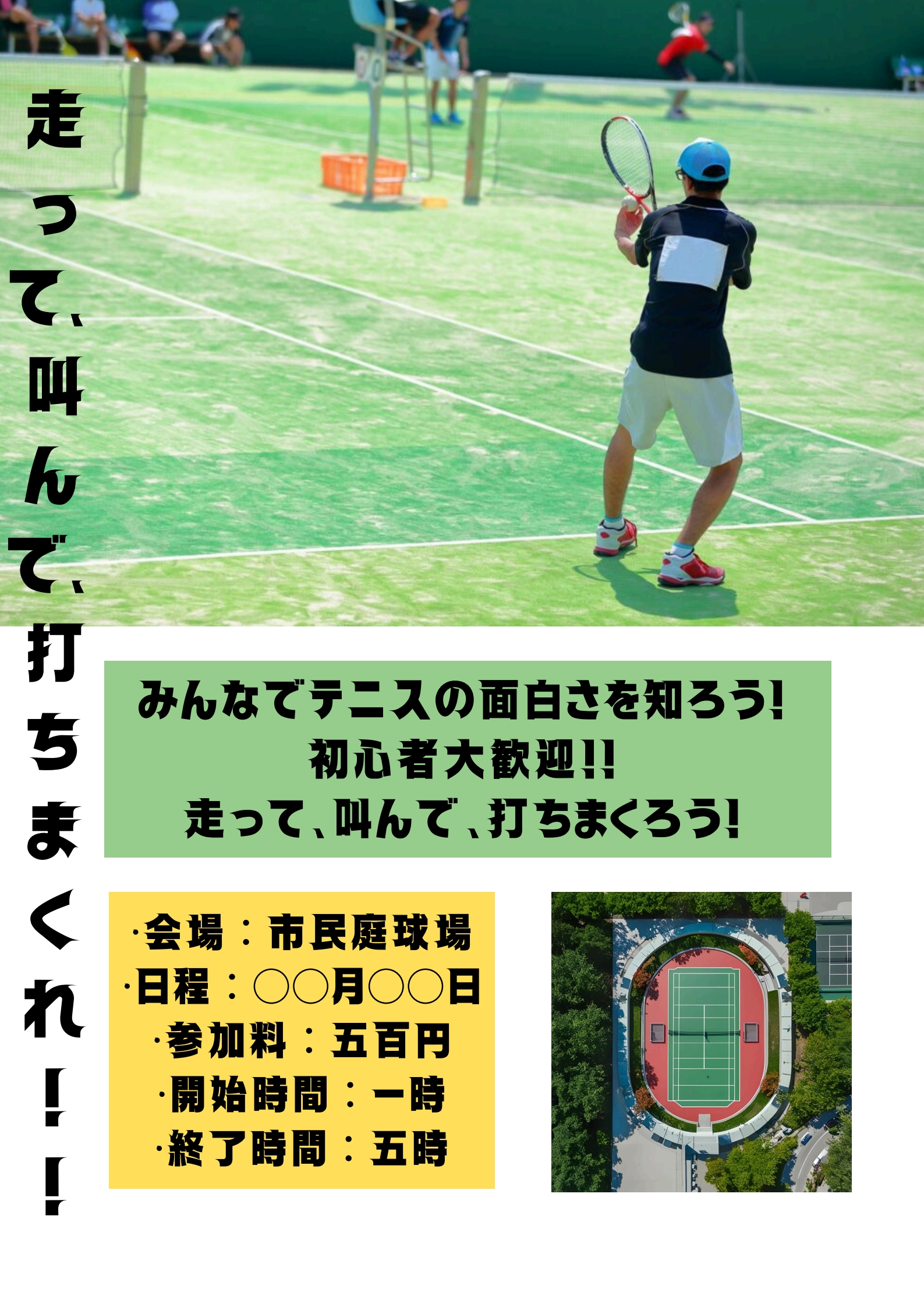 - 大きく縦書きのキャッチコピーは、軸をずらすことで動きを表現するなど、目を引く工夫が素晴らしいです!イベント情報を黄色の枠で構造化して見やすく整理したり、初心者歓迎という言葉で参加しやすさを伝えています。情報デザインの基本がしっかり押さえられた作品です!