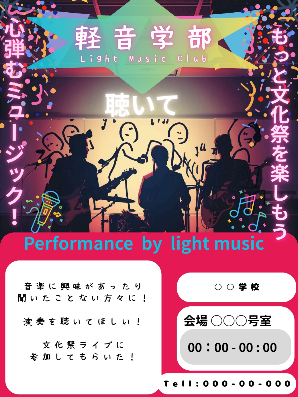 - カラフルなネオン風デザインでライブの熱気が伝わります!「もっと文化祭を楽しもう」の縦書きコピーが目を引き、ライブ写真のシルエットと装飾が雰囲気を盛り上げています。募集メッセージと開催情報を白い枠で構造化し、視線移動も自然。音楽への情熱が伝わる、完成度の高いポスターです!