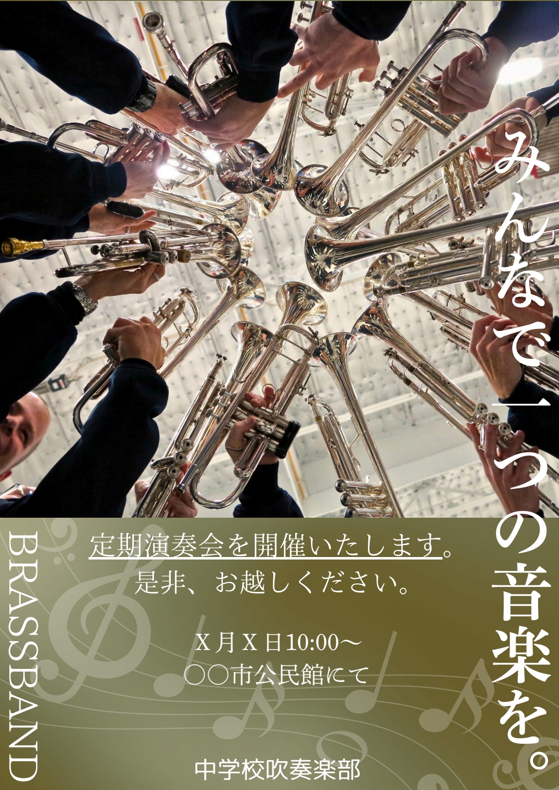 - トランペットを円形に配置した写真や「みんなで一つの音楽を。」で吹奏楽部の一体感が伝わってきます!日時・場所の情報も見やすく構造化されています。楽譜のモチーフや「BRASSBAND」の文字が装飾として効果的で、視覚的に美しいポスターに仕上がっていますね!