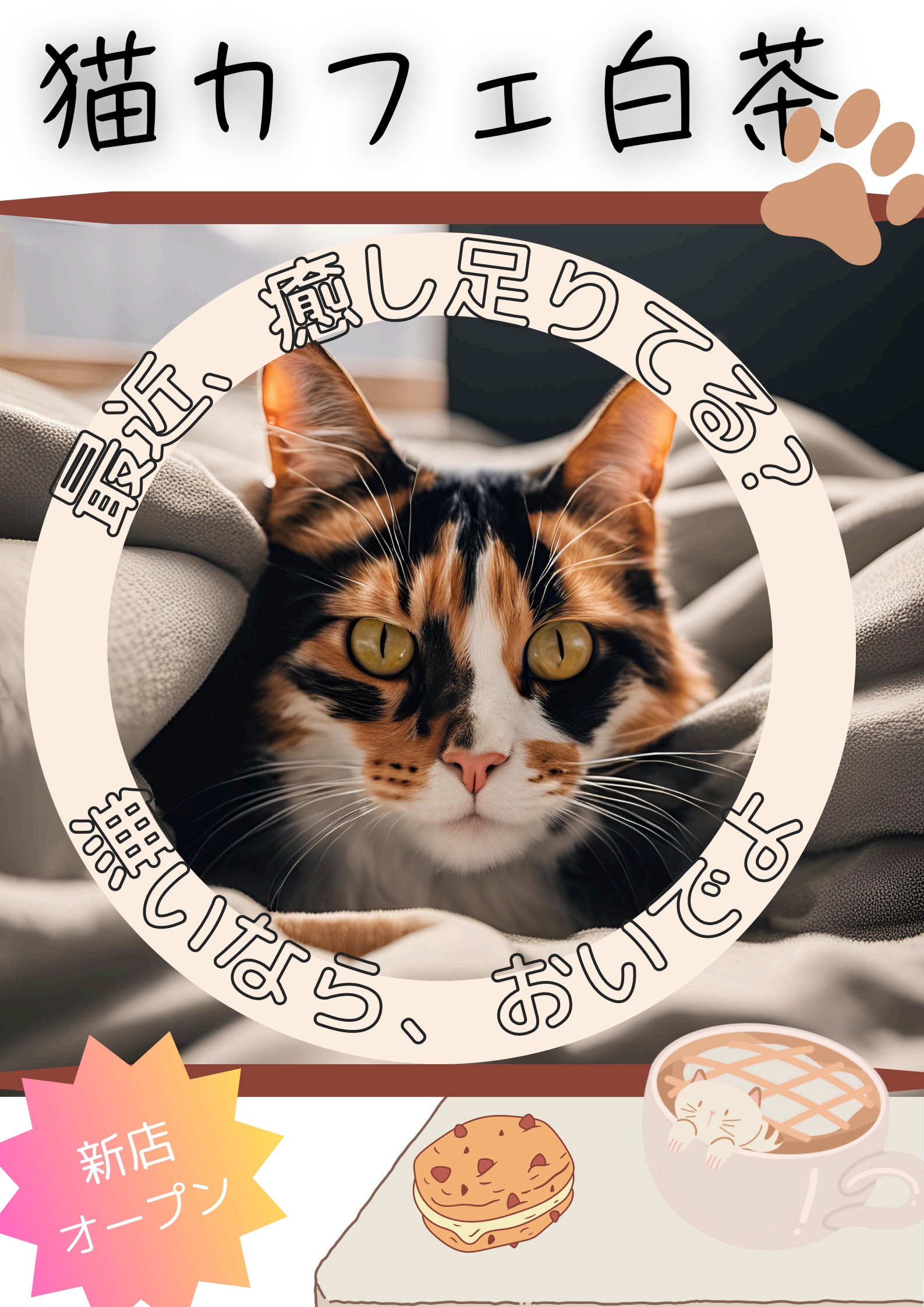 - 可愛い猫の写真を大きく中央に配置し、その周りに「癒し足りてる?」「無いなら、おいでよ」の呼びかけが、興味喚起と文字の構造化を両立させています。肉球やイラストの装飾も効果的!「新店オープン」の情報も重要なので、吹き出しで強調していますね。猫好きの心を掴む作品です!