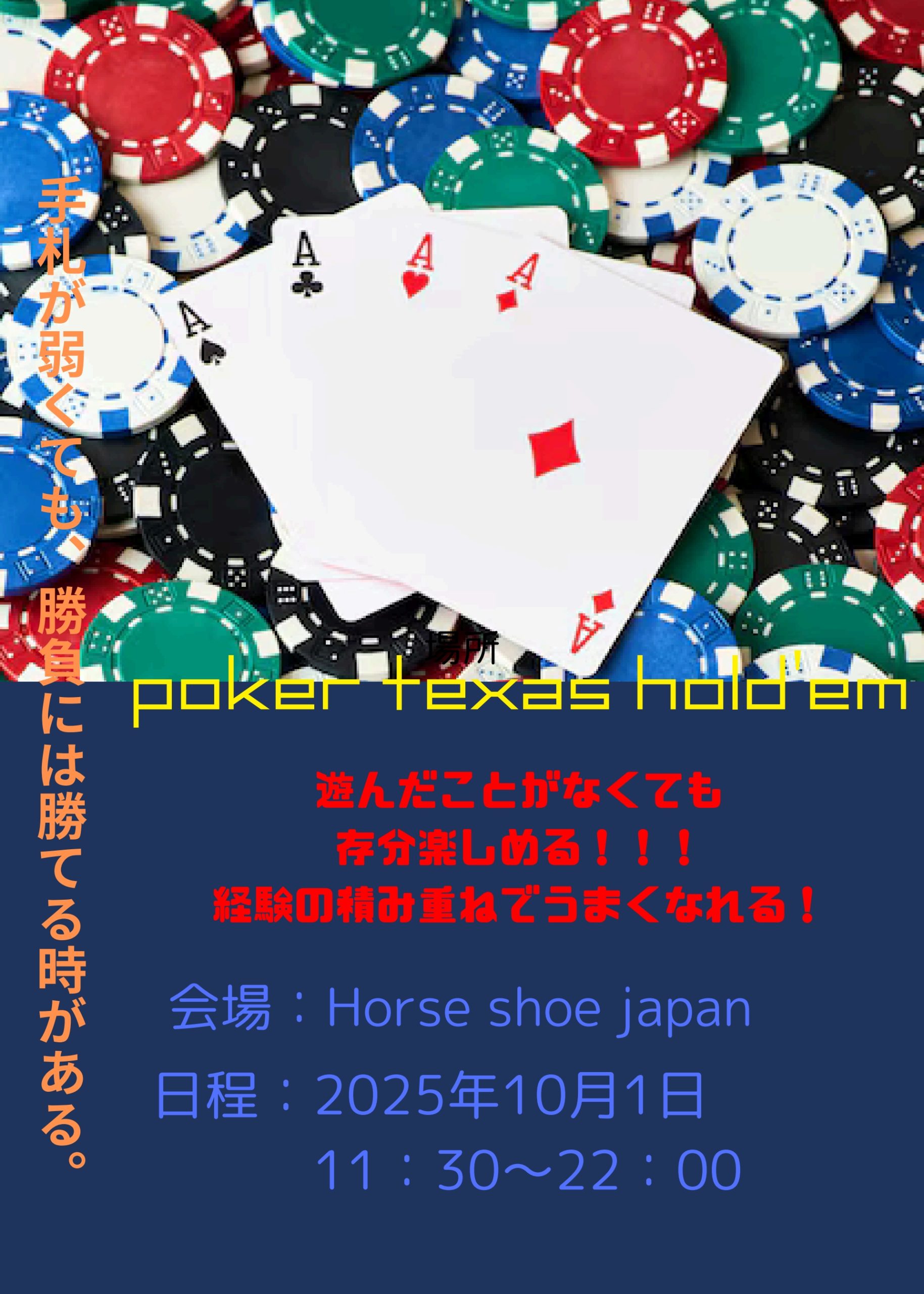 - ポーカーイベントのポスターですね。カラフルなチップとトランプの写真で雰囲気を可視化し、日時・場所の情報も構造化されており、縦書きのキャッチコピーが目を引きます。「遊んだことがなくても充分楽しめる!」というメッセージで参加ハードルを下げた初心者への配慮が光るポスターです!
