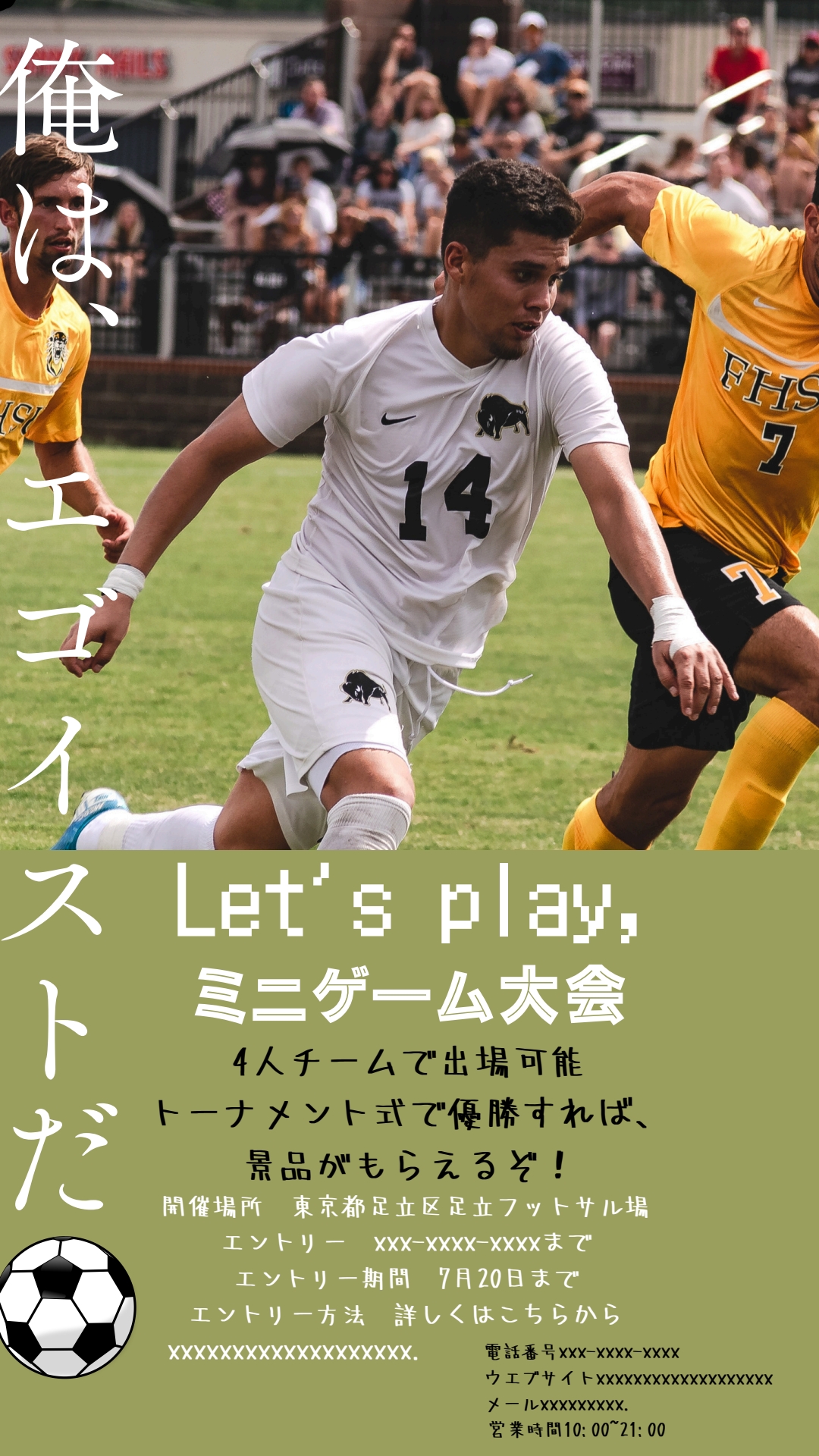 - 「俺は、エゴイストだ」のコピーが縦書き配置含めて秀逸!試合写真で臨場感を可視化し、開催情報やエントリー方法を構造化して見やすく整理されています。サッカーボールのイラストも効果的で、参加意欲を高めるポスターに仕上がっていますね。要素がバランス良く配置された作品です!