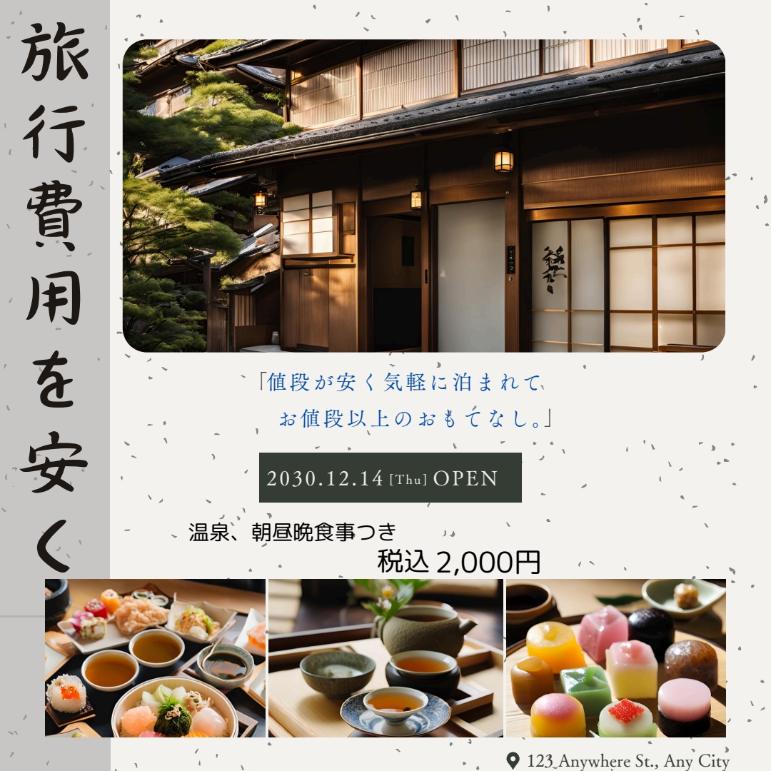 - 「旅行費用を安く」というメッセージで、コンセプトが明確に伝わります!日本旅館の美しい写真で雰囲気を可視化し、食事の写真を3枚並べて構造化し、視覚的に訴求力のあるポスターに仕上がっています。欲を言えば、温泉の写真も欲しかった!情報がバランス良く配置された作品です。