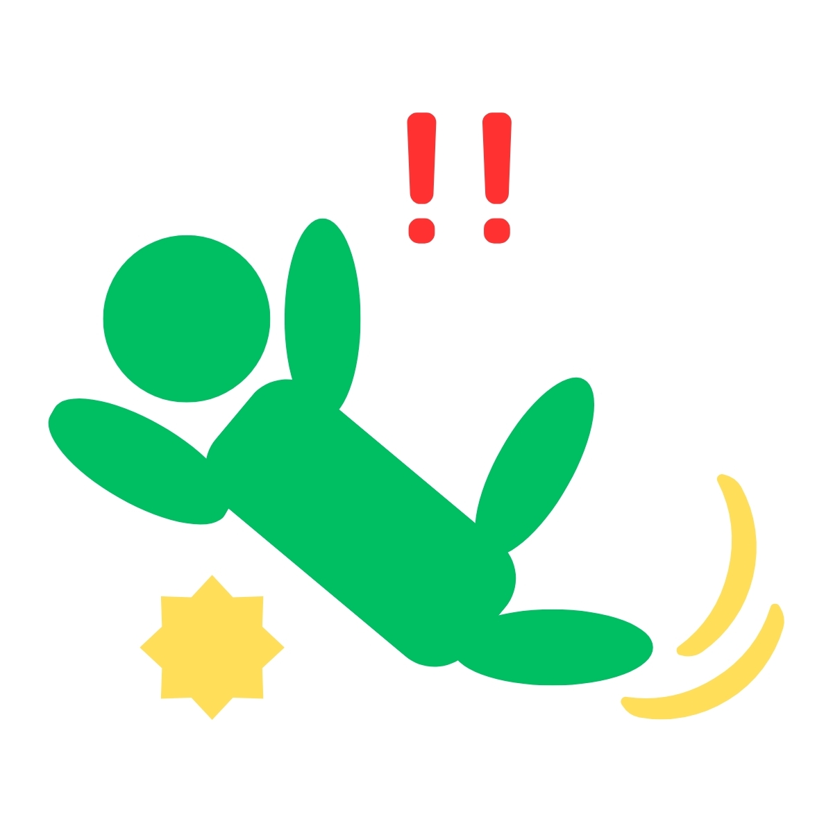 - 動きのある表現が印象的なピクトグラムですね。転倒のポージングと赤い感嘆符(!!)の組み合わせや、黄色い四角の2つ組み合わせで転んだ衝撃の表現・発想も面白いです。安全喚起をテーマにした躍動的なピクトグラムです!